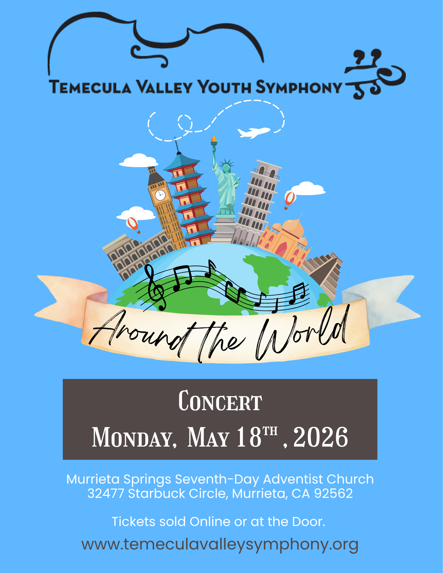 The Temecula Valley Youth Symphony invites you to attend our end of the Season Concert on Monday, May 18th, 2026! The Concert will be held at Murrieta Springs Seventh-Day Adventist Church in Murrieta at 7:30 PM, and will feature our talented students performing some wonderful Multi-Cultural Music from different cultures Around the World. One feature piece we will be performing is an Arrangement by our very own Conductor and Composer Dr. Sylvia Lee Mann, a compilation of music from different cultures which also features singers including acclaimed bass vocalist Michal Dawson Connor, an accomplished performer and composer of choral, chamber, and solo vocal works, with a particular emphasis on Slave songs created before the Civil War. This concert is sure to be a musical treat, and as always we appreciate patrons of the Temecula Valley Symphony and Youth Symphony that help support our students and their success!